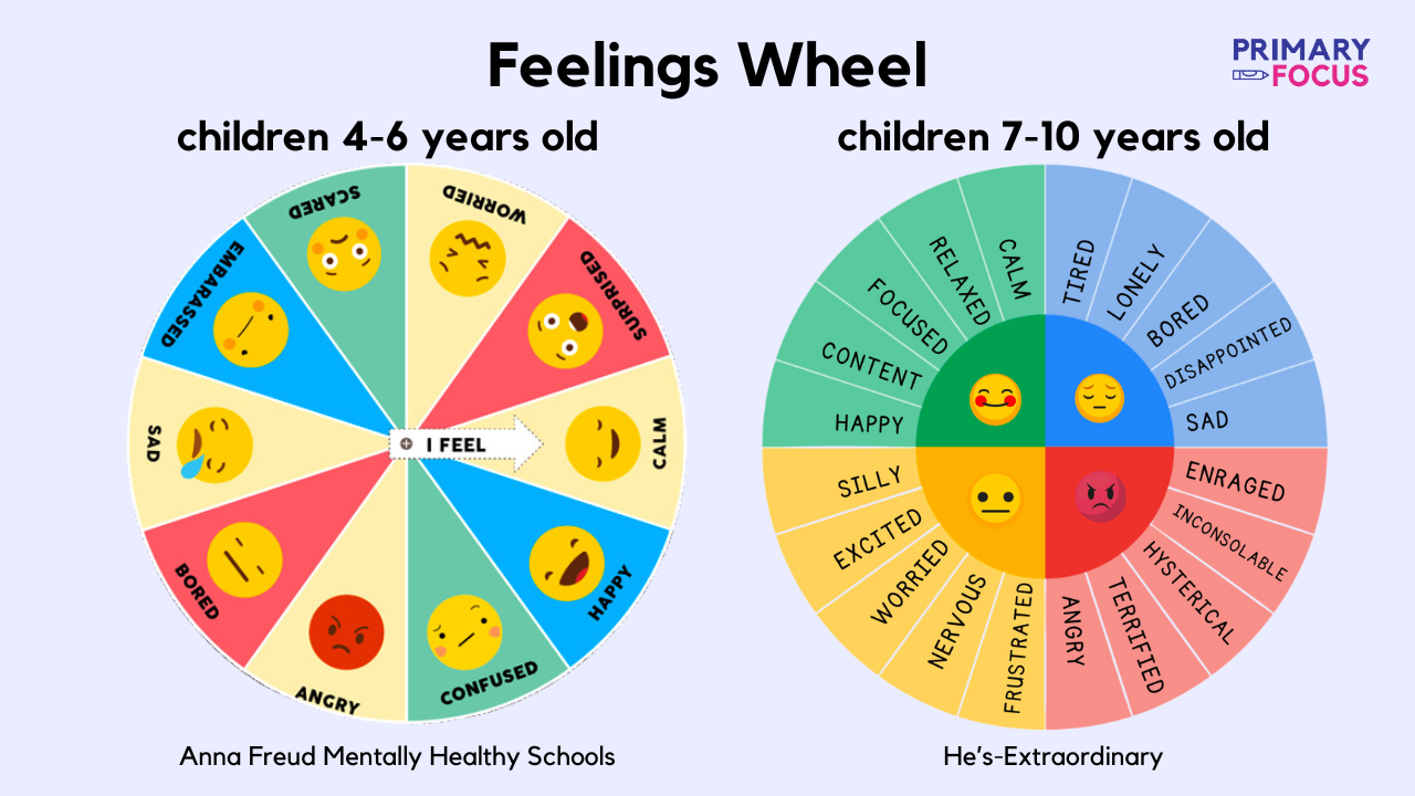 Based on Plutchik’s Emotion Wheel, you can find kid friendly versions online. You can download this one for ​children aged 4-6 here​ and this one for ​children 7-10 here.​